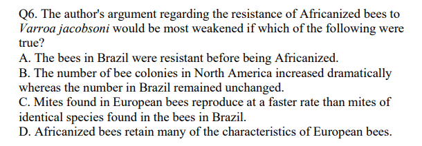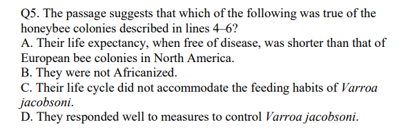 One advantage of breeding African bees with other bee types (Africanization)may be resistance to the parasitic mite Varroa jacobsoni, a major threat tomodern beekeeping. In parts of Europe, this mite is (5) devastatinghoneybees and killing many colonies despite preventive measures bybeekeeping. But in Brazil Varroa jacobsoni has been present in Africanizedbees since 1972 without the single colony killed, even though beekeepersthere undertook no preventive (10) measures. The mites lay eggs withinthebrood cells of immature bees, and developing mites feed on the hemolymph(blood) of bee pupae. But fewer mites reproduce in Africanized bees thaninEuropean bees. Some researchers point out that this resistance may be related to theAfricanized worker bee's shorter (15) development period, which preventssome mites from reaching maturity. Recently the mite has become seriousproblem in colonies of European bees in North America. Africanizationofthese bees may be the best safeguard against this parasite.