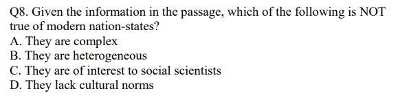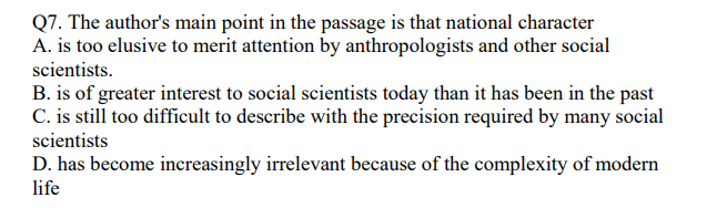 National character is not formally considered by social scientists indiscussing economic and social development today. They believe that peoplediffer and that these differences should be taken into account (5) somehow, but they have as yet discovered no way to include such variables in theirformal models of economic and social development. The difficulty lies inthe nature of the data that supposedly define different national characters. Anthropologists and others are on (10) much firmer ground when theyattempt to describe the cultural norms for a small homogeneous tribe orvillage than when they undertake the formidable task of discovering thenorms that exist in a complex modern nation-state composed of manydisparate groups. The (15) situation is further complicated by the nature ofjudgments about characters since such judgments are overly dependent onimpressions and since, furthermore, impressions are usually stated inqualitative terms, it is impossible to make a reliable comparison betweenthe(20) national characters of two countries.