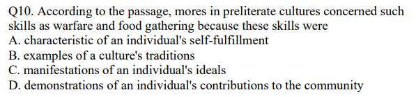 Many philosophers disagree over the definition of morality, but mostdisputants fall into one of two categories: egocentrics, who define moralityas the pursuit of selt-fulfillment, and socio(5) centrics, who define moralityas an individual's obligations to society. Where does the truth lie?Fortunately, the stem of the word "morality" provides some clues. The word"mores" originally referred to the customs of preliterate cultures. (10) Mores, which embodied each culture's ideal principles for governing every citizen, were developed in the belief that the foundation of a community lies inthecultivation of individual powers to be placed in service to the community. (15) These mores were concerned with such skills as food-gathering andwarfare as well as an individual's relationships with others. Thus, I submit "morality" must be concerned with what is honored by the communityatlarge. However, self(20) fulfillment is important to morality becauseunfulfilled citizens, no matter how virtuous, cannot performthe dutiesmorality assigns them.
