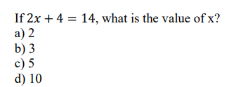 If 2x = 8, what is the value of x?a) 2b) 4c) 6d) 8
