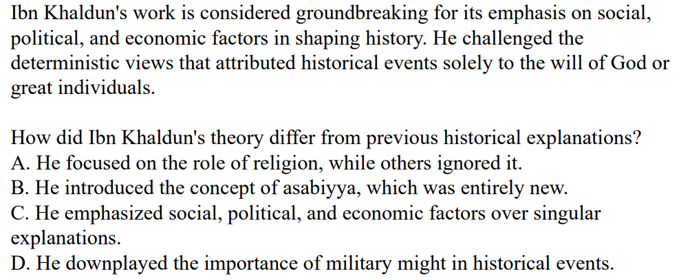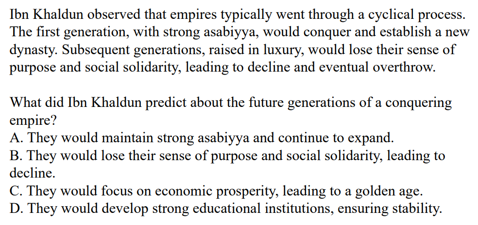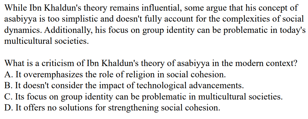 According to Ibn Khaldun, what is essential for the rise and fall of civilizations? A. Technological advancementsB. Strong leadershipC. Social cohesion (asabiyya)D. Geographic location